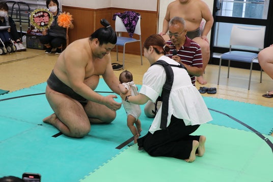 続いて、お相撲さんとの取組に挑戦。小さな子どもは、軽々と持ち上げられましたが、泣くこともなく笑顔で喜んでいました。また、生後4か月の赤ちゃんも親子で土俵に上がり、その微笑ましい取組に大きな拍手が送られました。