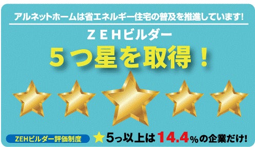 注文住宅のアルネットホームを展開する大賀建設株式会社(本社:埼玉県さいたま市大宮区、代表取締役:須賀 亮、以下アルネットホーム)は、ZEHビルダー評価制度において5つ星ビルダーに認定されました。