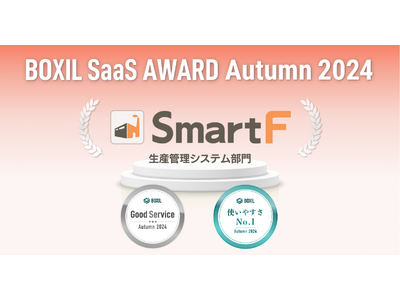 今回生産管理クラウドシステム「スマートF」が受賞した「Good Service」は、「BOXIL SaaS」上に投稿された口コミを対象に、各カテゴリで総得点の高いサービスに対して付与されるものです。また「使いやすさNo.1」は「BOXIL SaaS」上に投稿された「口コミによるサービス評価」9項目を対象に、各カテゴリ、各項目において一定の基準を満たした上で、最も高い平均点を獲得したサービスに対して付与されるものです。