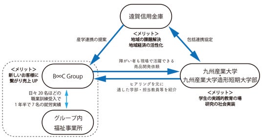 九州産業大学・九州産業大学造形短期大学部は、2021年8月に遠賀信用金庫との包括連携協定を締結しています。同社は遠賀信用金庫と取引があり、日々の課題や状況を共有する中で、課題解決の一つの方法として、遠賀信用金庫から産学連携の提案を受けました。産学連携の取り組みは、ただ自社内の課題を解決するだけでなく、それが地域の人材育成にも繋がる点に魅力を感じ、商品開発の依頼をする運びとなりました。