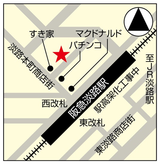 今回オープンする淡路応援団は、阪急淡路駅の西改札口から徒歩1分、とても便利な場所です。淡路駅周辺では現在、駅高架化工事が行われており近い将来、駅周辺が一変すると思われます。