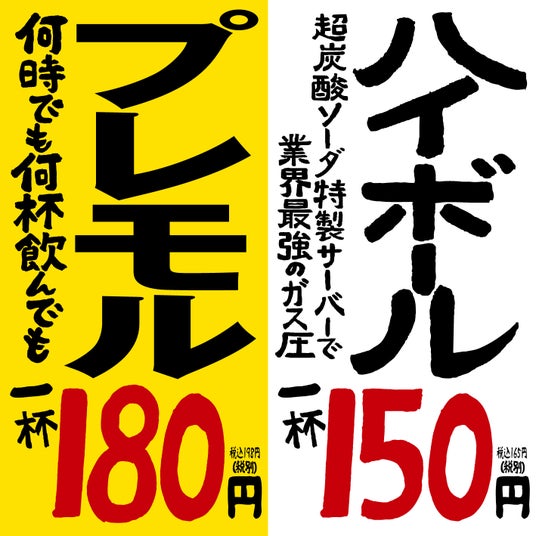 創業時から一貫して生ビールが驚安価格の一杯180円(税別)!現在はサントリー(株)の上級ビールである「ザ・プレミアムモルツ」を180円でご提供。もちろん何杯飲んでも同じ価格!10杯飲んだってたった1800円(税別)です。さらにハイボールも創業時から一杯150円(税別)という格安価格を守り続けております。
