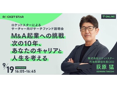 株式会社ロケットスター(本社:東京都港区、代表取締役社長CEO:荻原 猛、以下「ロケットスター」)は、9月19日(木)16時5分より『サーチファンド説明会 ~M&A起業への挑戦 次の10年、あなたのキャリアと人生を考える~ 』を、オンラインにて実施します。