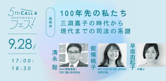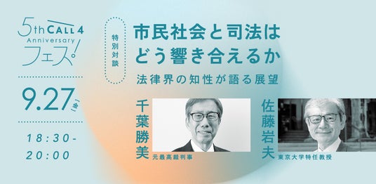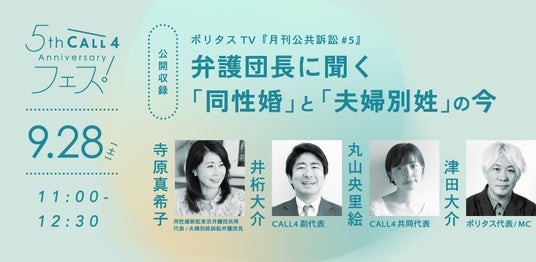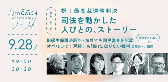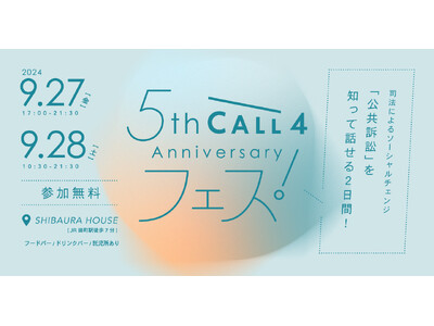 日本初(※1)の公共訴訟支援に特化したウェブプラットフォームCALL4(コールフォー)(運営:認定特定非営利活動法人CALL4、共同代表理事:谷口太規、丸山央里絵)は、正式リリース5周年を記念して9月27日(金)・28日(土)に東京で「CALL4フェス!」を開催いたします(11月には関西開催を予定)。