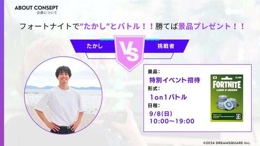 日本最大規模の学生ビジネスコンテスト「YUME PRO学生ピッチ甲子園」による学生起業家支援の一環として、会場はYUME PRO2025実行委員会の丸の内線銀座駅地下改札前 YUME PRO特設ブースを提供していただきました。DREAMSQUARE 代表取締役 の”たかし”とFortniteの1on1で勝利すると、優勝賞金 V-bucks総額3万円の限定イベント招待券 をもらえます!