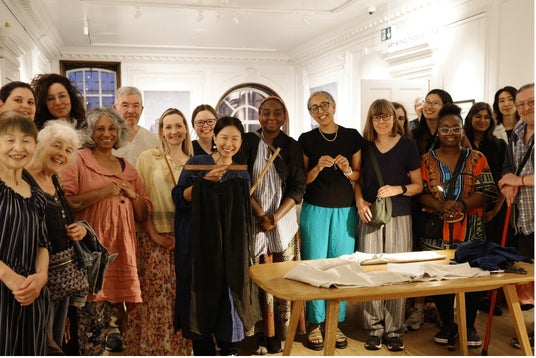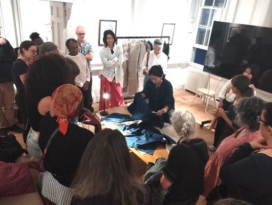 今回、民芸に特化した英国史上最大の展覧会”Art Without Heroes Mingei”にて現代の民藝を象徴するエココンシャスブランドとして石徹白洋品店の商品が取り上げられています。その中で、8月29日に展覧会のイベントの一環として石徹白洋品店が作る直線の裁断と縫製のみで作る伝統的な民衣「たつけ」の裁断を披露するデモンストレーションを行いました。デモンストレーションは、展示スペースに併設されたホールにて開催され、20名~25名のイギリス人、英在住の日本人などが参加しました。