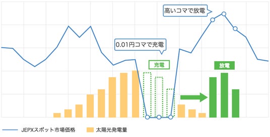 今回、Sassorが新たに開発した制御ロジックでは、JEPXのスポット市場価格を予測し、下限価格となるコマでの発電分を蓄電池に充電、高値になるコマで販売を行うことで収益増を実現します。