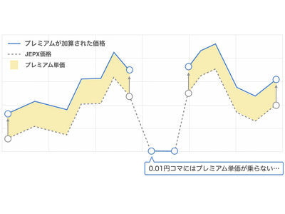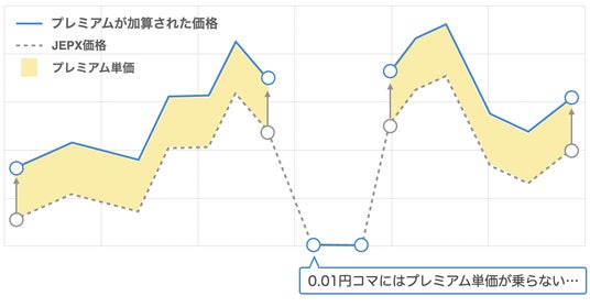これを回避するためには、下限価格のコマでの電力販売を減らし、他のコマで販売する必要があるのですが、太陽光発電などの自然エネルギーを発電のエネルギー源とする電源は、発電量をコントロールすることができないため、下限価格となるコマが発生するとプレミアム獲得の機会損失となってしまいます。