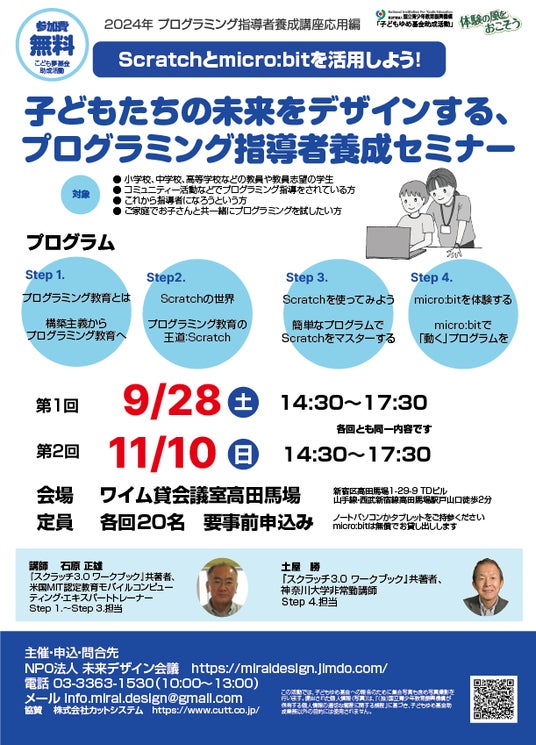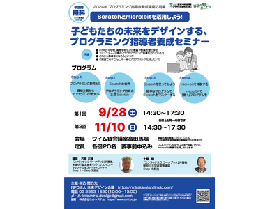 NPO 法人未来デザイン会議(本部:東京都新宿区、代表:石塚勝敏)は、2024 年 9 月 28 日(土)、11 月 10日(日)に東京都新宿区高田馬場にて無料セミナー「プログラミング教育指導者養成講座応用編」を開催いたします。