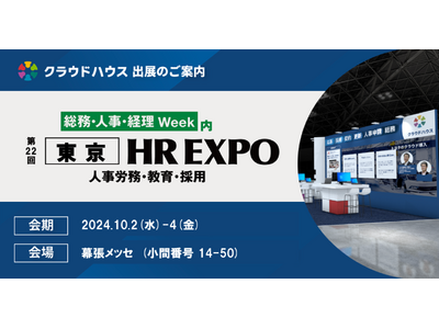 大企業向け人事労務クラウド『クラウドハウス労務』を運営する株式会社Techouse(本社所在地:東京都港区、代表取締役社長:礒邉 基之)は、2024年10月2日(水)から4日(金)まで開催される「第22回総務・人事・経理Week 秋」内の「東京 HR EXPO」に出展いたします。