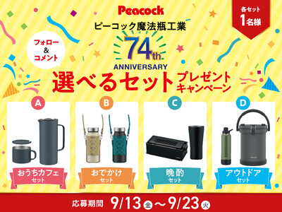 ピーコック魔法瓶工業株式会社(本社:大阪市、社長:山中千佳)は、2024年9月13日(金)から9月23日(月)までの期間、創業74周年を記念しておすすめのセットが抽選で4名様に当たるキャンペーンを開催します。