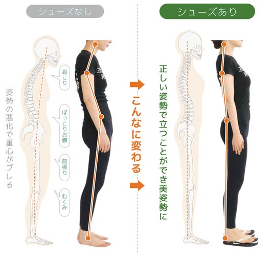 当商品は、正しい骨・筋肉の動きへと導くかかと重心が履くだけで行えるので、誰でも簡単にまっすぐ骨格が叶い、痩せやすいカラダづくりを力強くサポートします。