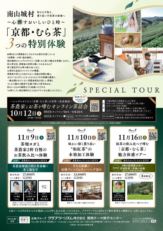 宇治茶の3割を生産しているお茶の銘産地・南山城村にて、2024年11月9日(土)・10日(日)・16日(土)に、「京都・むら茶」をテーマにした3つの特別体験ツアーを実施します。