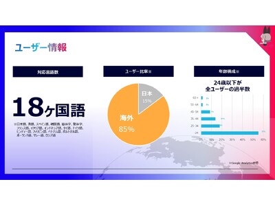サービスの開始から世界に向けたプロダクト作りを続けており、対応言語数は18カ国語、ユーザーの海外比率は85%にまでのぼるサービスとなりました。ユーザーの年齢層は24歳以下が最も多く、若年層に支持されています。