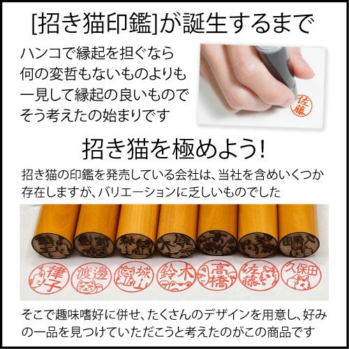 印鑑の印面に、縁起の良い招き猫のデザインと名前が半分ずつを彫り込まれた内容となっています。