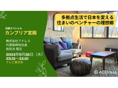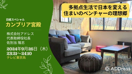 住まいのサブスクリプションサービス「ADDress」(運営会社:株式会社アドレス、本社:東京都千代田区、代表取締役社長:佐別当隆志)は9月26日(木)、テレビ東京系『日経スペシャル カンブリア宮殿』の特集「多拠点生活で日本を変える住まいのベンチャーの理想郷」で放送されます。
