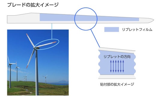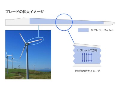 実証実験では、9月10日より1年間、リブレットフィルムを装着した風車を試験運転し、関連データなどの取得を行い、発電効率の向上とリブレットフィルムの装着箇所の耐久性などを確認します。風況条件の近い1,000kWの風車2基を3ペア選び、一方にリブレットフィルムを装着し、もう一方は装着せず、リブレットフィルムの有無による発電量等を比較します。