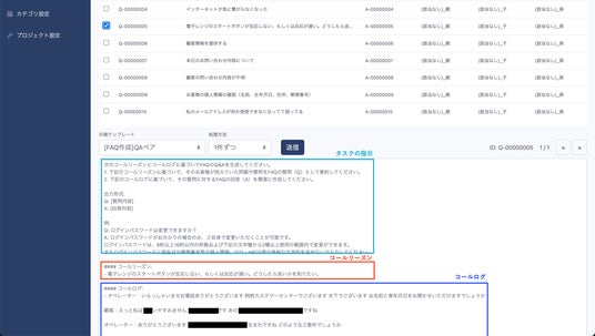 Q&Aペア作成の指示をする画面。土台となるコールリーズン・コールログを選択し、Q&A作成用のテンプレートに載せて生成AIにリクエストを送る。(図中のコールログはダミーデータです。)