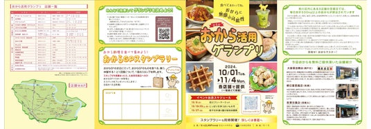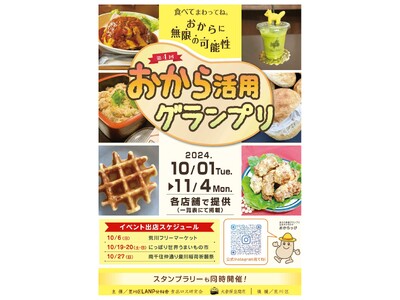 (3)概要:食品ロス問題への意識が高い、荒川区の商店主が集まって開催します。大倉屋豆腐店(南千住)、朝日屋豆腐店(町屋)、吉澤豆腐店(西尾久)の3店舗から無料で提供された「おから」を活用し、参加店舗19店がオリジナル料理やスイーツ、変わったアイデア商品・サービスを開発。参加店舗で対象商品を購入・注文するともらえる投票券を使い、Web投票でグランプリを決定。参加店舗を巡るスタンプラリーも同時開催し、スタンプを8個集めると、大倉屋豆腐店で「おからGPマスター」の称号とエコバックが貰えます。