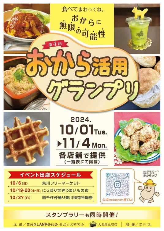 荒川区では、地域全体で楽しみながら食品ロスについて考えるとともに、店舗とお客様をつなげて絆を深めるため、「おから活用グランプリ」を開催いたします。