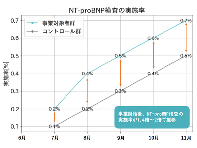 4カ月の事業評価期間でBNP検査及びNT-proBNP検査実施率が増加。事業による検査促進効果が認められた。