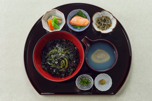 その上質な海苔の風味を最大限引き出すために出汁にもこだわりました。その決め手は「国産はまぐり」を使用していること。昆布と鰹節を使ったふじヱ茶房の自家製出汁に、はまぐりを合わせることで、はまぐりのコハク酸、昆布のグルタミン酸、鰹節のイノシン酸の3つの旨み成分が組み合わさり、海苔の良さを存分に引き出す極上の「合わせ出汁」に仕上がりました。アクセントに海ブドウを添えることで、食感の違いと共に広がるさらなる磯の香りをお楽しみいただけます。