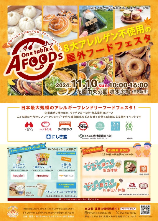 大阪府内で食物アレルギー対応の食品を扱うお店が中心となり「食物アレルギーがあってもなくてもい っしょにたべよ」をテーマに、8大アレルゲンと呼ばれる卵・乳製品・小麦・エビ・カニ・ソバ・落花 生(ピーナッツ)・くるみを原材料に使用しない食品が並ぶ屋外イベント「第2回ゆめのちからマルシェ」 が、11月10日(日)東大阪市花園中央公園にて開催されます。 食物アレルギーのある家庭では、お祭りの露店や外食のときに限られた物しか口にできないことが多く ありますが、本イベントはアレルギー当事者もご家族もお友達も、どなたでも「おいしく、たのしく過 ごしていただける夢のような場をつくりたい」という想いで企画された、年に一度の秋祭りです。