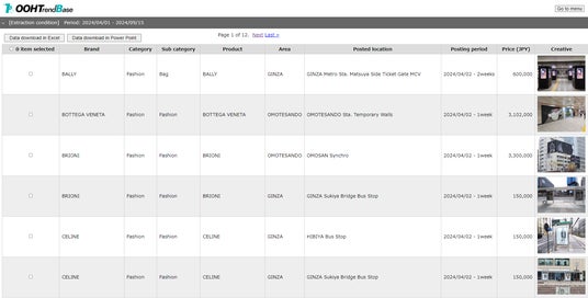 「OOH TrendBase」ツール内では、期間・エリア・ブランド・カテゴリー・サブカテゴリーを自由に選択して集計、グラフの作成が可能となっており、出稿情報をデータベース上でタイムリーに確認出来るだけでなく、出稿情報や画像をPPTファイル・EXCELファイル形式でのダウンロードも可能。