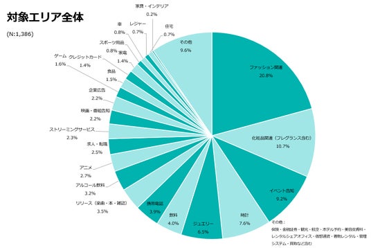 表参道、渋谷、原宿、六本木、銀座など流行感度の高いエリアをモニターしているため、ファッション関連(特にラグジュアリーブランドの出稿)がトップ、次いでフレグランスを含む化粧品の出稿となっている。また、ファッション、化粧品、時計、ジュエリー関連の出稿で半数以上を占めている。