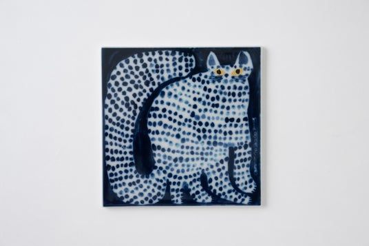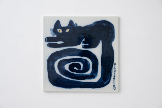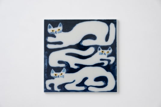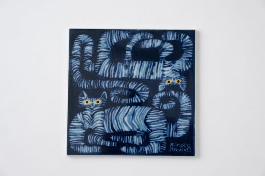 展覧会に合わせて、1点ものの猫のタイルなども作りました。長年の日々の中で生まれてきた猫の絵や、グッズも猫だらけ。ぜひ、猫にまみれに来てください。