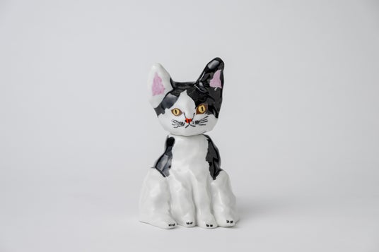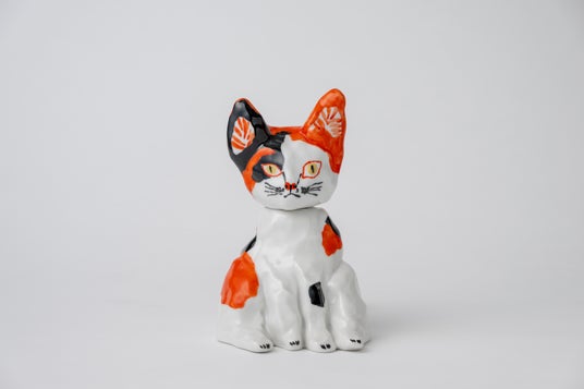 わたしの描く猫を立体にしたい、という連絡をもらったのが、2年前のことでした。招き猫ミュージアムを訪れたり、中外陶園さんで様々なサンプルを眺めたりしながら、想像を膨らませましたが、絵から立体になる過程をどうしたらいいのか、さっぱりわかりません。しばらく悩んだ後、「いっそ、自分で作ってみよう!」そう思って粘土をこね始めました。そしてできたのはなんともいびつで、おかしな佇まいの猫でした。でもわたしらしい、猫。そのサンプルを送って、細かな調整を何度も重ねてもらい、形になっていきました。くるくる首が回るのは、立体だからこそできる表現。それぞれの柄に合わせた素材を試行錯誤するのもとても楽しい時間でした。中外陶園さんの丁寧な手作業で、たくさんの猫たちが生まれていく様子は、胸にグッとくるものがあります。わたしの手の跡がたくさん残った猫たちが、それぞれの場所へ旅立ち、愛されますように。