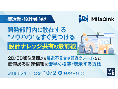 製造業・メーカーの設計業務を効率化のためのシステム開発・コンサルティングを提供する株式会社ミラリンク(本社:福岡県北九州市、代表取締役:佐取直拓)は、メーカー開発・設計部門向けセミナー「開発部門内に散在する"ノウハウ"をすぐ見つける、設計ナレッジ共有の最前線 ~ 2D/3D類似図面から製造不具合や顧客クレームなど、価値ある関連情報を素早く検索・表示する方法 ~」を開催いたします。
