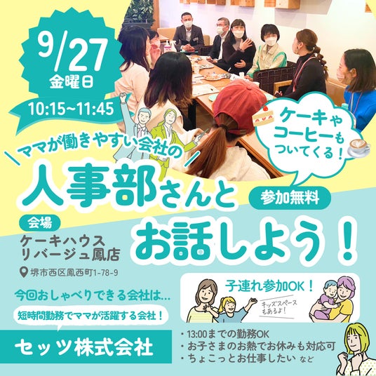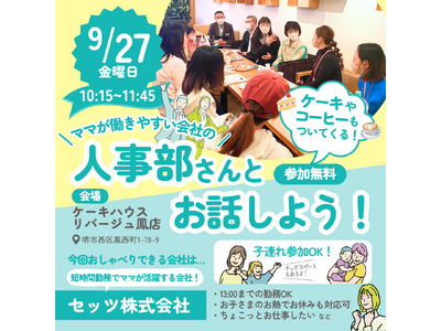株式会社マミー・クリスタル(本社:大阪府摂津市、代表取締役社長:新田 昌恵)は、2024年9月27日(金)に、潜在求職者である子育て中の女性を対象にセッツ株式会社(本社:大阪府堺市西区、代表取締役社長:大前 敏和)と合同で“ママが働きやすい会社”の「人事部さんとお話しよう!」を開催しました。