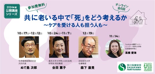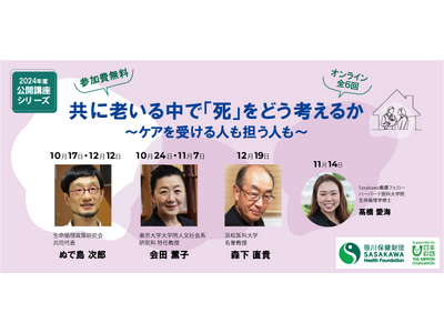 笹川保健財団(東京都港区、会長 喜多悦子)は、2024年10月17日(木)より、「共に老いる中で『死』をどう考えるか ~ケアを受ける人も担う人も~」と題して、6回シリーズのオンライン公開講座を開催いたします。