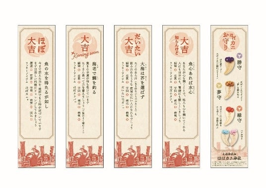 運試しガチャは、ほぼカニ神社横に設置されたカプセルマシンにて発売いたします。各カプセルには、手作り体験施設 てっちゃん工房で販売している「ほぼカニ爪御守 4種」と、ほぼカニ神社の御祭神、ほぼカニ様からの“ほぼ”にまつわるお告げが記された「おみくじ」が同封されています。ここでしか手に入らない特別なアイテムをぜひお楽しみください。