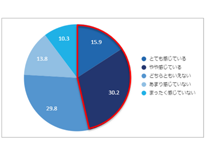 ストレスにより精神面の不調や不安を感じることがあるか聞いたところ、「とても感じている」(15.9%)、「やや感じている」(30.2%)、「どちらともいえない」(29.8%)、「あまり感じていない」(13.8%)、「全く感じていない」(10.3%)でした。