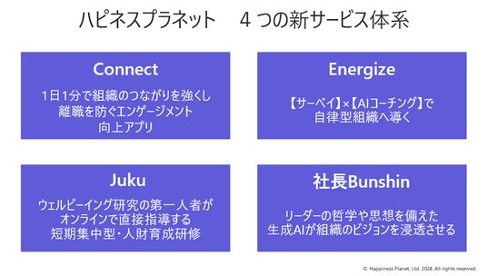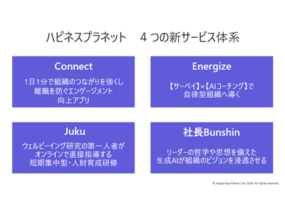 株式会社ハピネスプラネット(本社:東京都国分寺市、代表取締役CEO:矢野和男、以下ハピネスプラネット)は、企業がウェルビーイング経営を実現するための新たなサービス群をリリースします。各サービスには生成AI技術が組み込まれており、従業員のつながりづくり・リーダーシップの強化・ビジョンの浸透などを支援します。これにより、エンゲージメントの向上・離職防止や幸せで生産的な職場環境の構築を実現します。