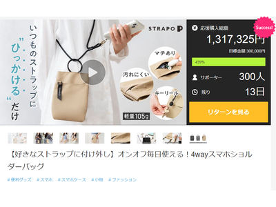 株式会社はちみつクリエイト(代表取締所在地役社長:田中義之/所在地:東京都板橋区)がよりマクアケにて公開した新製品、外付けスマホショルダーの「STRAPO」は公開初日に目標金額30万円を達成しました。