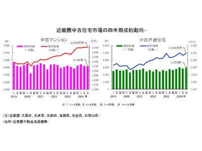 (公社)近畿圏不動産流通機構が10月15日に発表した2024年7~9月期の近畿圏の中古マンション成約件数は、4,146件(前年同期比プラス7.3%)と4期連続で増加し、市場の売り出し(新規登録)件数は16,662件(前年同期比プラス6.7%)となりました。近畿圏の対象12地域中9地域で成約件数が増加し、大阪市と京都市は5期連続で増加するなど、総じて取引は堅調でした。