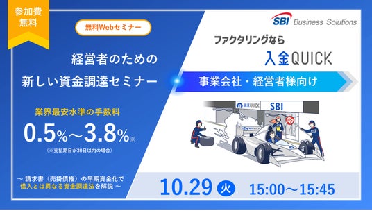 総合フィンテックソリューション企業であるSBI FinTech Solutions株式会社の子会社で、バックオフィス支援サービスを提供するSBIビジネス・ソリューションズ株式会社(本社:東京都港区、代表取締役社長:夏川 雅貴、以下「当社」)は、事業会社・経営者様向けに「業界最安水準の手数料0.5%~3.8%*1!新しいファクタリング 入金QUICKセミナー」を10月29日(火)15時から開催しますので、お知らせいたします。
