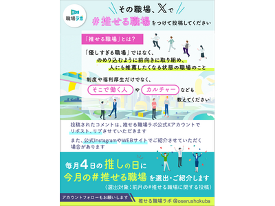 このキャンペーンでは、誰もが自慢したくなる「自社の推せるところ」を見つけ、「#推せる職場」をつけてX上で投稿していただく形で応募を受け付けています。毎月4日、推しの日に皆様からの投稿の中から選出された「#推せる職場」を発表し、月間賞を授与します。選定基準は以下の4つに基づいています。