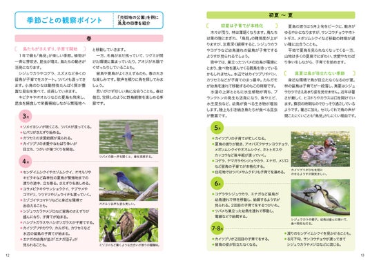これから野鳥観察を始めたい方に向けて、いつ、どこに、どのような鳥がいるのか、どのように観察すればよいのかをていねいに解説しています。双眼鏡の選び方や使い方、野鳥観察の服装や撮影のポイントなども紹介しました。