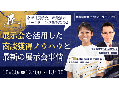 株式会社セールスのタクミ(本社:東京都中央区、代表取締役:佐藤匠)とエバーリッジ株式会社(本社:東京都港区、代表取締役:石山文彦)は、BtoBマーケティングにおける展示会の有効性に関する無料オンラインセミナーを2024年10月30日(水)に開催いたします。
