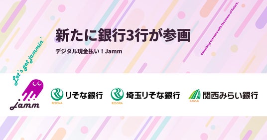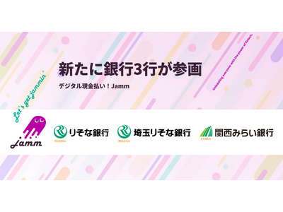 Let’s get Jammin’!自由な決済社会の実現を目指す株式会社Jamm(代表取締役CEO 橋爪捷、以下Jamm)は、A2A決済(※1)ブランド決済サービス「デジタル現金払い!Jamm」に「りそな銀行」「埼玉りそな銀行」「関西みらい銀行」の銀行3行が参画いたしました。