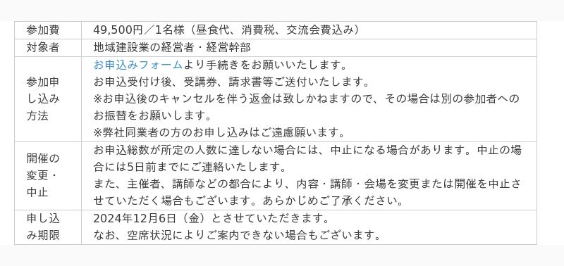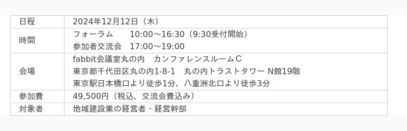 建設業フォーラム終了後、同会場同部屋にて参加者交流会を開催いたします。参加者同士の情報交換や他地域の経営者とのネットワークづくりの機会としてご参加いただければ幸いです。途中の出入りは自由です。