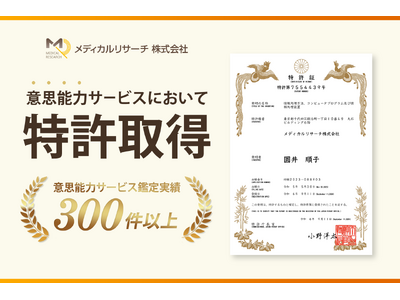 メディカルリサーチ株式会社(東京都千代田区、代表取締役・圓井 順子)は、医療鑑定事業の一環として展開している高齢者の意思能力サービスにおいて、特許を取得したことをお知らせいたします。