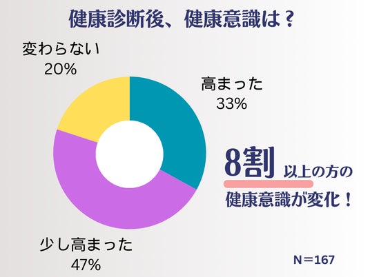 実に8割以上の方が、健康診断後に健康意識が以前よりも「高まった」と答えています。