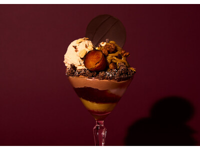 今回のパフェでは、金蜜芋を中心に、チョコレートやナッツ、爽やかなライチとフランボワーズの酸味など、15種の手作りパーツを重ねて構成されています。