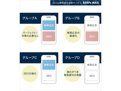 SERPs MAXの初期診断を実行することで、検索語句のグループごとに4つのタイプに大きく分けられます。それぞれのグループに対して、注力すべき検索語句や、検索広告における打ち手などをご提案致します。