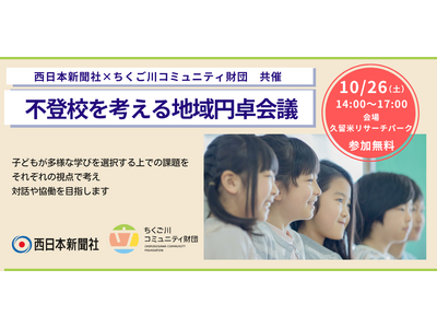 一般財団法人ちくご川コミュニティ財団(所在地:福岡県久留米市梅満町、代表理事:宮原信孝、以下「ちくご川コミュニティ財団」)は、不登校の子どもたちが置かれている状況や課題について市民が集まって考える「不登校を考える地域円卓会議」を、株式会社西日本新聞社(本社:福岡県福岡市中央区、代表取締役社長:田川大介、以下「西日本新聞社」)と共催いたします。